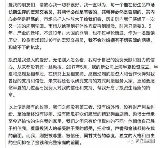 10月21日,半夏投资的老板李蓓发了一份公开信,来解释她和前夫梁文涛离婚这件事情,全文贴出来,满足吃瓜群众八卦需求:
