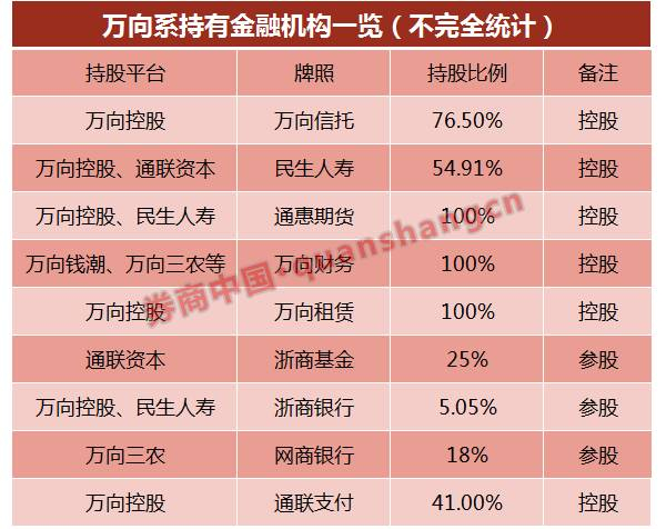 截至目前,万向系持股直接控股万向信托、民生人寿、通惠期货和万向财务公司,参股多家金融机构。其中,鲁伟鼎曾担任过万向信托董事长、万向财务董事长、浙商银行监事长、现在依然担任民生人寿董事长。