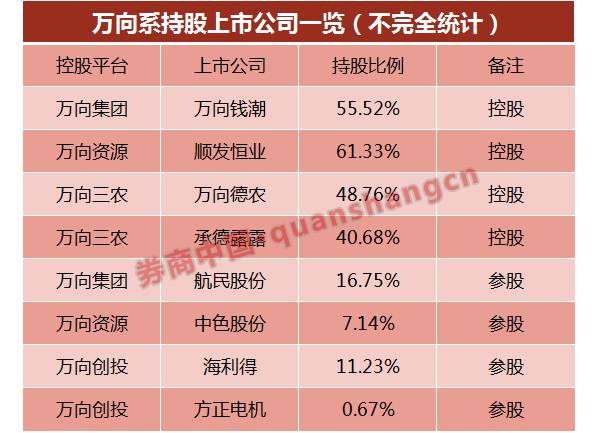 据券商中国记者不完全统计,除了上述4家直接控股上市公司,万向系还通过旗下万向资源、通联资本等参股多家上市公司,其中,中色股份(000758.SZ)、航民股份(600987,SH)、海利得(002206.SZ)、广汽集团(601238.SH)、方正电机(002196.SZ)等均有过万向系身影。