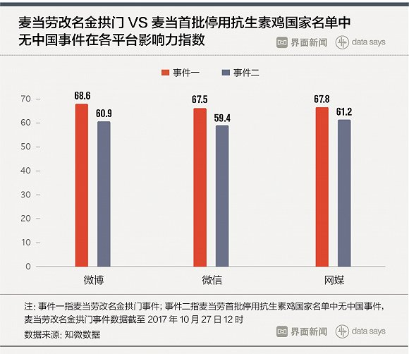 8月23日,麦当劳(美国)宣布,2018年起将逐步停止使用抗生素鸡,而中国不在其公布的一、二批名单事件,也成为了当时的热点事件。对比其在微博、微信、网媒三个平台的影响力指数,都低于麦当劳改名金拱门事件。