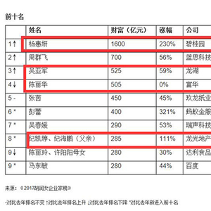 得益于地产股价格上涨的还有港股上市公司龙湖地产(00960.HK)的实际控制人,重庆女富豪吴亚军以525亿元的身家,成为排名第三位的女富豪。