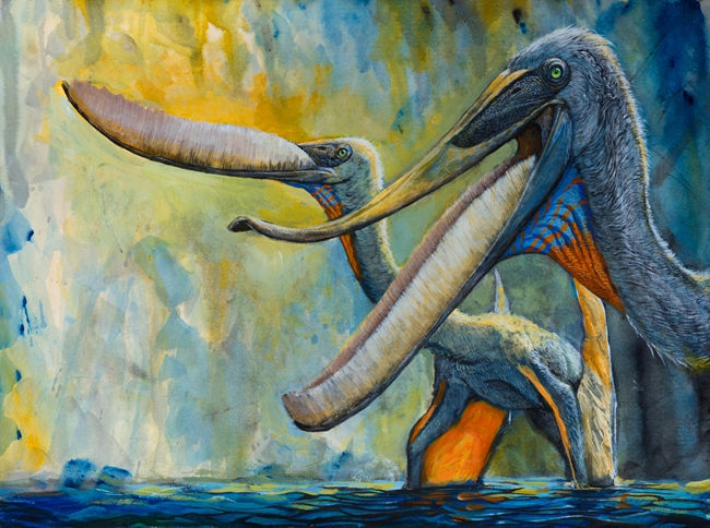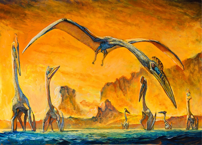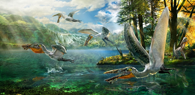 赵闯画的不少翼龙和水怪身上,还带着绚丽的色彩。这些颜色也是艺术加工想象出来的吗?赵闯解释,他添加的颜色是通过科学家对化石沉淀进行研究而推测出来的。比如沧龙化石上半部分集中了大量黑色素,科学家推测这可能是黑色深灰色。根据翼龙化石可以看到,翼龙翅膀有很多层,最上面一层保留有色素,这是因为翼龙翅膀膜很薄,且是白天出来的动物,表面就有一层像涂料一样的防晒色素积累。雷神翼龙化石的头部,有一前一后两根棍子一样的骨头。赵闯专门做过类似实验,发现它的骨架结构和船帆类似,这样转头时可以更加灵活,所以在《它们——翼龙时代》中,他给雷神翼龙画上帆船似的漂亮头冠,“中间是膜,要走血管,所以就用了红色”。