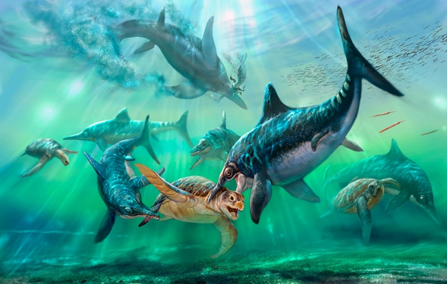 恐龙时代和水怪时代早已谢幕,但生生不息的密码却一直从远古延续至今。赵闯说,有时画着画着,他就觉得地球其实就像一艘巨轮,有的乘客上去,有的乘客下来;有的一成不变地在船上繁衍,有的从量变转到质变。这种脉络图一路理下来,可以让今天的人类看清在自然界所处的位置,更清晰地分析很多问题。