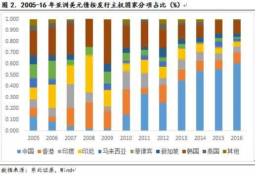其三,亚洲美元债市场蓬勃发展占全球总发行额近半,其中中资占比从09年不到2%,至16年超6成遥遥领先第二名占比1成的韩国且增势迅猛,增量美元债的发行需求仍远未饱和。