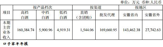 另据口子窖2017年半年报显示,公司2017年上半年高档白酒收入为160,384.74万元;中档白酒收入为5,900.96万元;低档白酒收入为4,919.31万元。
