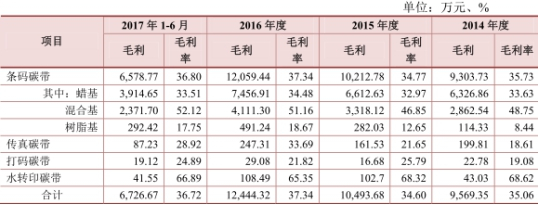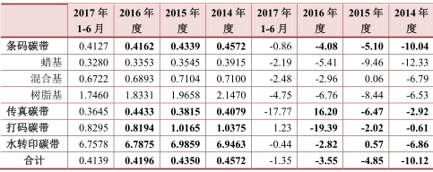 报告期内,公司条码碳带产品的均价分别为0.5083元/平方米、0.4572 元/平方米、0.4339 元/平方米、0.4162 元/平方米和 0.4127 元/平方米,价格呈下降趋势,各期变动分别为-10.04%、-5.10%、-4.08%、-0.86%。