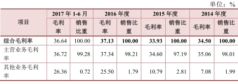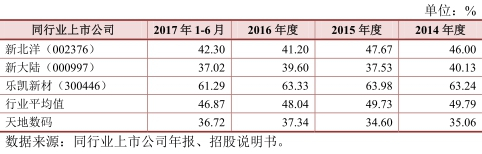 2013年至 2017 年 1-6月,天地数码综合毛利率分别为 36.24%、34.50%、33.93%、37.13%和 36.64%,其中主营业务毛利率分别为 37.05%、35.06%、34.60%、37.34%和 36.72%。