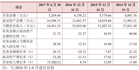 此外,2013年至2017年1-6月,天地数码存货分别为3,957.93万元、4,801.76万元、5,179.66万元、4,158.22万元、5,269.44万元,占营业收入的比例分别为15.89%、17.24%、16.60%、12.25%、28.56%。占总资产的比例分别为22.05%、23.94%、21.38%、14.64%、16.23%。