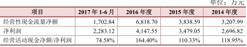 报告期内,2014 年至 2016 年经营活动产生的现金流量净额与净利润匹配程度高,均超过 100.00%;2017 年 1-6 月经营活动产生的现金流量净额小于净利润,主要系 2017 年上半年,为了应对原材料蜡的市场价格处于上升趋势以及“高性能热转印成像材料生产基地项目”的部分生产线建成后产能不断增加的影响,公司积极储备了较上期更多的原材料以备生产使用,公司采购金额增加所致。