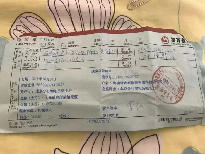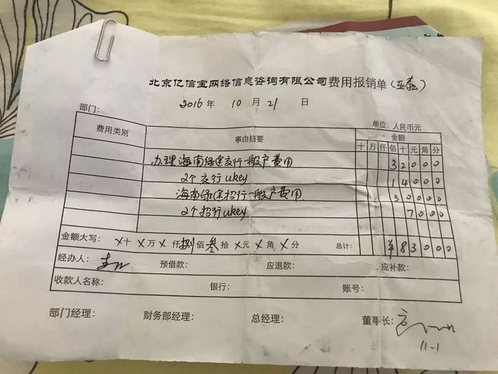 海南绿途新能源乘用车租赁有限公司曾在豆包金服的官网上发布过借款信息。但讽刺的是,该公司的银行对公账户都是由亿信宝申请的,在费用报销单上还能看到该公司财务李红和董事长高水成的签名。