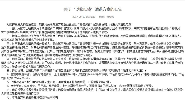 针对目前逾期的几个项目,9月19日, 豆包金服运营公司北京亿信宝网络信息咨询有限公司(下称“亿信宝”)便发布了一则 “以物抵债”清退方案的公告。