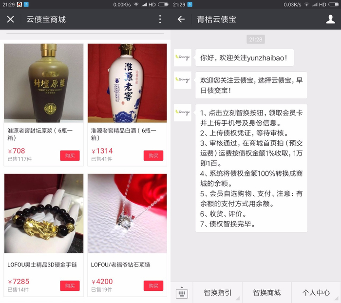 胡先生告诉记者,豆包金服通过青桔云债宝,用松芝电视、老福爷钻石项链、淮源酒等“三无商品”置换债权,且定价离谱。