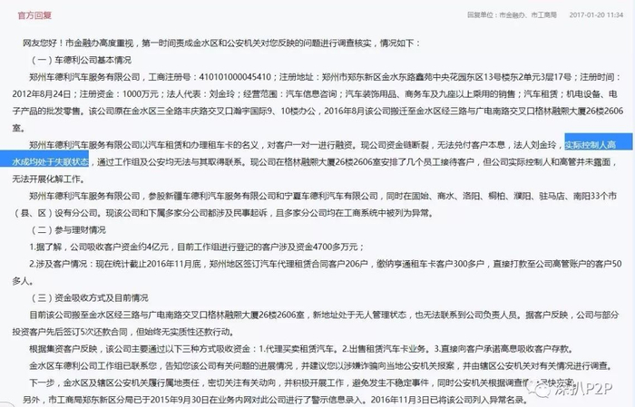 2017年1月20日,根据郑州市金融办的官方回复:相关部门反映该公司实际控制人高水成已处于失联状态,金水区车德利公司工作组已联系您,告知您该公司有关问题的进展情况,并建议您以涉嫌诈骗向当地公安机关报案,并由辖区公安机关对有关情况进行调查。