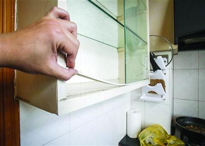 受伤后,小雪和大钟检查了厨房的橱柜,发现橱柜左右推拉滑轨与柜面的粘连处因为胶水老化,已经完全失去粘性,滑轨因此变得十分松动。另一扇没有坠落的玻璃也摇摇欲坠,随时都有掉落的危险。