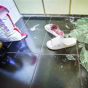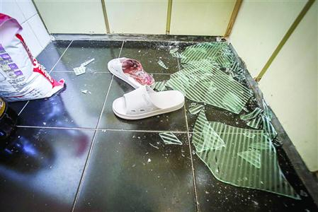 橱柜的玻璃突然脱落,碎裂一地。 本版图片/晨报记者 张佳琪
