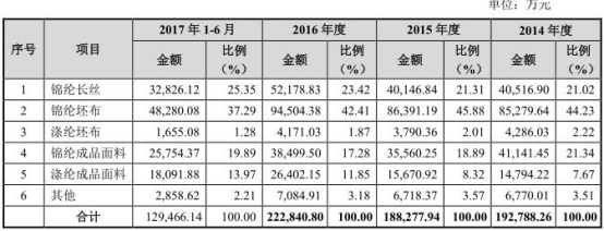招股书显示,锦纶长丝、锦纶坯布、锦纶成品面料是公司的主要产品,三类产品合计占主营业务收入的比例保持在 80%以上。2012年-2017年1-6月,公司锦纶长丝平均销售价格分别为3.04元/千克、2.63元/千克、2.34元/千克、2.16元/千克、1.87元/千克、2.20元/千克。锦纶坯布平均销售价格分别为4.39元/米、4.23元/米、4.14元/米、3.77元/米、3.66元/米、4.31元/米。锦纶成品面料平均销售价格分别为9.39元/米、9.75元/米、10.20元/米、10.09元/米、10.35元/米、11.20元/米。