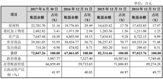 招股书显示,2012年-2017年1-6月,公司存货账面价值分别为78,699.86万元、89,589.24万元、89,274.28万元、71,806.85万元、59,733.65万元、66,859.49万元,占流动资产的比重分别为47.90%、47.21%、49.77%、44.97%、40.85%、41.97%。存货周转率(次)分别为1.70、1.72、1.72、1.86、2.55、2.85。