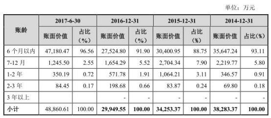 招股书显示,报告期内,应收账款结构以 1 年以内为主。2014 年-2017 年1-6月,公司 1 年以内的应收账款比例分别为 98.91%、96.65%、97.43%和 99.11%,账龄结构合理。