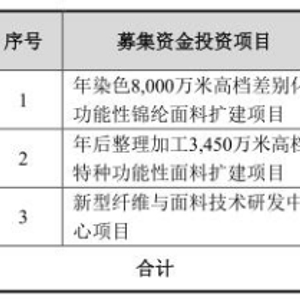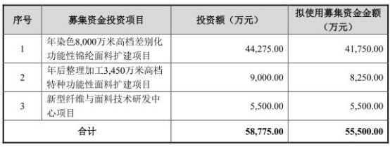 台华新材本次募集资金净额55,500.00万元用于年染色8,000万米高档差别化功能性锦纶面料扩建项目、年后整理加工3,450万米高档特种功能性面料扩建项目、新型纤维与面料技术研发中心项目。