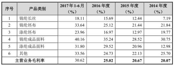 招股书显示,2012年-2017年1-6月,公司主营业务毛利率分别为23.95%、21.40%、20.07%、20.67%、25.02%、30.62%。2014 年-2016 年,公司锦纶丝业务毛利率分别为7.19%、12.44%、15.69%。同行公司相关业务毛利率平均值分别为8.34%、9.68%、9.89%。2014 年-2016 年,涤纶坯布毛利率分别为19.77%、12.97%、16.97%。涤纶成品面料毛利率分别为12.98%、20.96%、29.52%。同行公司相关业务毛利率平均值分别为9.34%、9.97%、12.45%。
