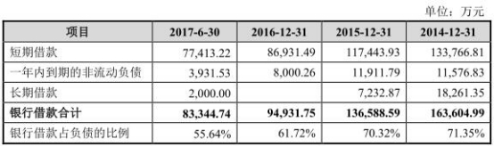 招股书显示,近年来公司银行借款保持在较高水平,2014年-2017年1-6月,银行借款分别为 158,195.03万元、190,395.63万元、163,604.99 万元、136,588.59 万元、94,931.75万元和 83,344.74 万元,2014年-2017年1-6月,公司相应的利息支出分别为 11,828.99 万元、9,420.01 万元、5,941.77 万元和 2,051.42 万元,金额较高。公司银行借款占负债总额的比例分别为 71.35%、70.32%、61.72%和 55.64%,占比较高,是公司负债的主要组成部分。