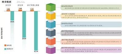 大举收购的背后,是赫美集团资金上的捉襟见肘。公开数据显示,三季度公司经营活动产生的现金流量净额为-2.56亿;自2016年至2017年三季度,上市公司资产负债率分别为60.26%、68.24%。三季报显示,赫美集团负债合计42.35亿,比期初增加32%。