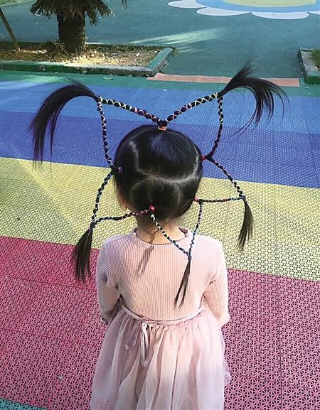 记者从照片里看到,一个小女孩穿着粉红色裙子,站在幼儿园的操场边,辫子被扎成了一款“五角星”。最让人忍俊不禁的是,五个角的每个角还有一束头发,头顶的两个角对着天空。整个“五角星”辫子支起来顶在头上,非常有型。记者还发现,“五角星”辫子没有用任何辅助发饰来支撑。