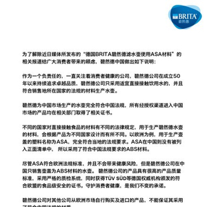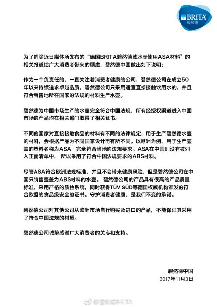 碧然德中国公司在近期的官方微博中称,不同国家对直接接触食品的材料有不同的法律规定,ASA材质的滤水壶盖符合欧洲法规要求,但由于ASA在中国没有被列入正面清单中,所以采用了符合中国法规要求的ABS材料。碧然德中国还强调,公司在中国只销售壶盖为ABS材料的水壶,所有经授权渠道进入中国市场的产品均在相关部门取得了相关证书。