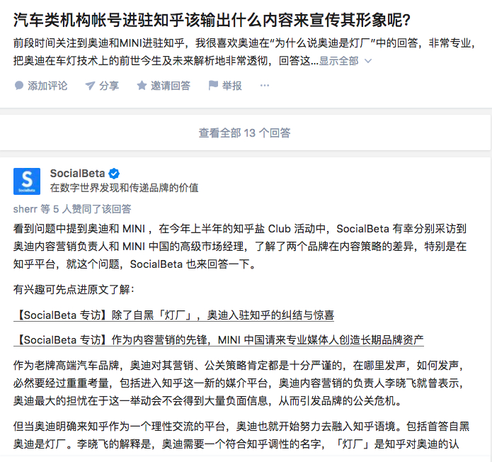 关于在知乎上的营销玩法,相信大部分品牌主仍停留在品牌答主的视角中,找寻备受用户关注而又话题或行业相关的问题,由品牌从自身专业或经验进行回答,给予用户别样的视角和内容。最常被提到的经典案例莫过于奥迪“刨”出几年前的骨灰级话题“为什么说奥迪是灯厂”,旧提装新酒,让奥迪作为品牌在知乎上迅速抢位。