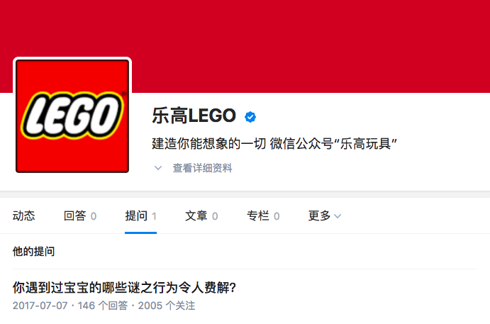 从乐高的机构号主页,不难看出,乐高是刚来到知乎的新人。它目前在知乎上仅通过品牌提问提了一个问题。