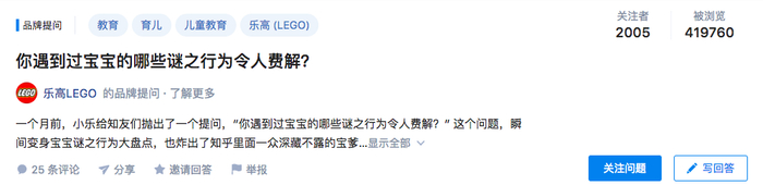 知乎的品牌提问功能上线后,乐高在知乎上提了一个问题:你遇到过宝宝的哪些谜之行为令人费解?