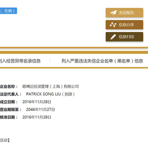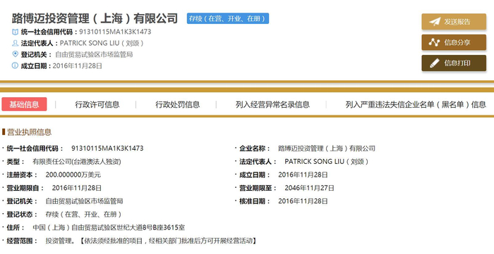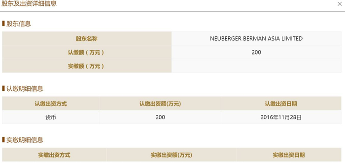 工商登记资料显示,路博迈投资管理(上海有限公司)成立于2016年11月28日,注册资本200万美元,其股东为“NEUBERGER BERMAN ASIA LIMITED”,法定代表人为刘颂。