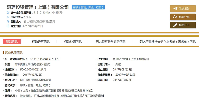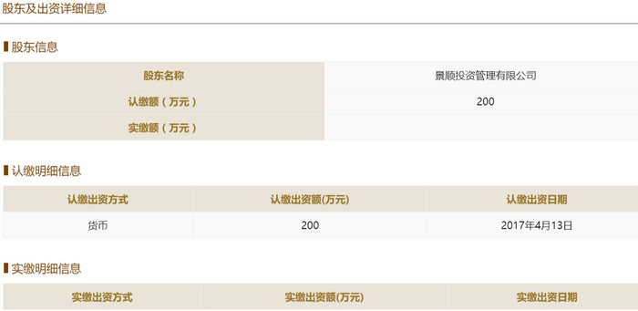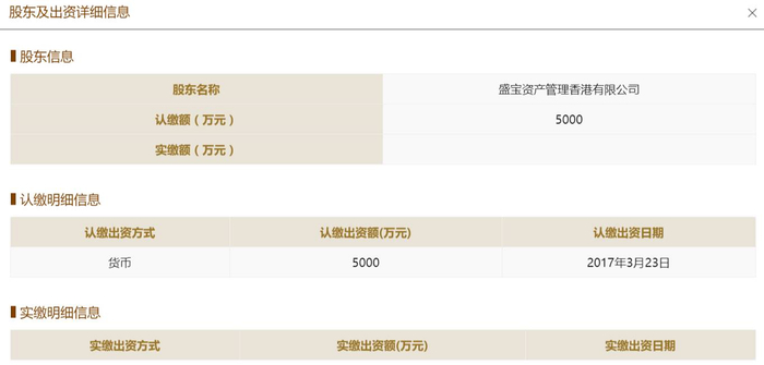 工商登记资料显示,该公司成立于2017年3月23日,法定代表人关威,注册资本5000万人民币,股东方为盛宝资产管理香港有限公司。
