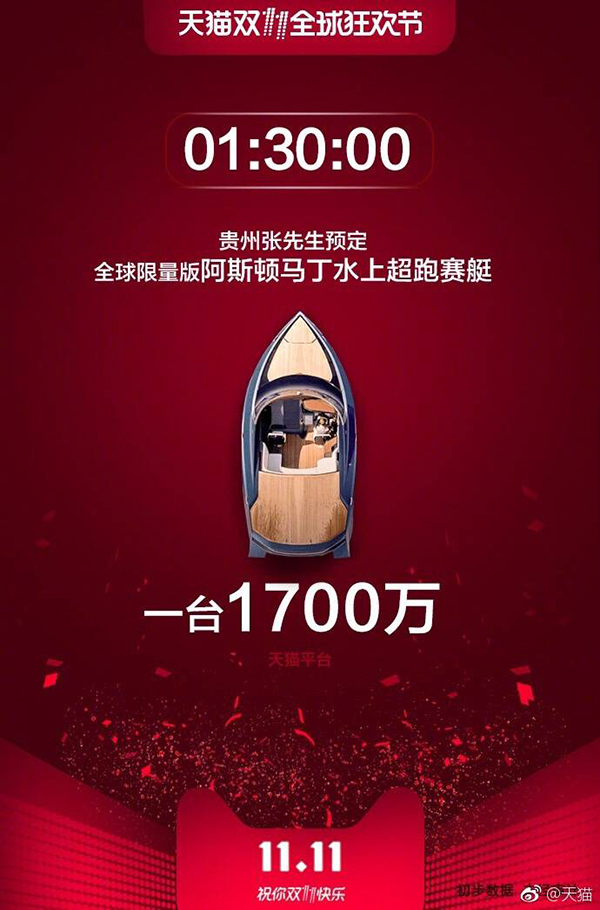 据悉,这份订单由一位贵州的买家预定支付,购买的商品则是来自欧洲奢侈品牌,阿斯顿马丁的价值近1700万的全球限量定制版水上超跑赛艇,这份订单除了刷新今年天猫双11的单笔订单记录外,也创下了跨境进口零售史上最高货值单笔订单纪录。