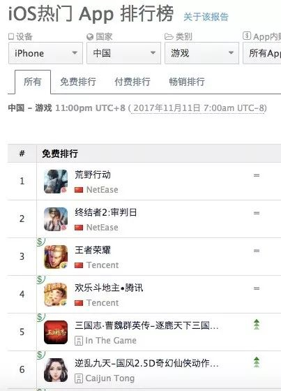 这些游戏上线以后迅速吸引游戏爱好者,根据APP应用数据分析平台App Annie截至11日的数据,《荒野行动》和《终结者2:审判日》占据了iOS平台免费游戏排行榜的头两把交椅。