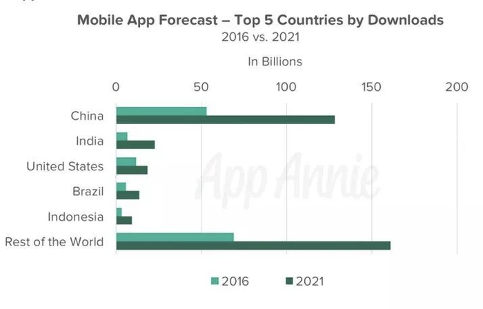 根据App Annie今年发布的预测,全球消费者在手游领域的消费额将在2021年将达到1052亿美元。中国将是下载量和消费者支出方面最重要的单一市场。在2016年至2021年间,中国地区手游类APP下载量的复合年均增长率将达到19%,消费者支出的复合年均增长值更将高达24%。到2021年,全球市场所有APP的总消费额将达到1390亿美元,中国将占据其中的560亿美元和1300亿下载量。