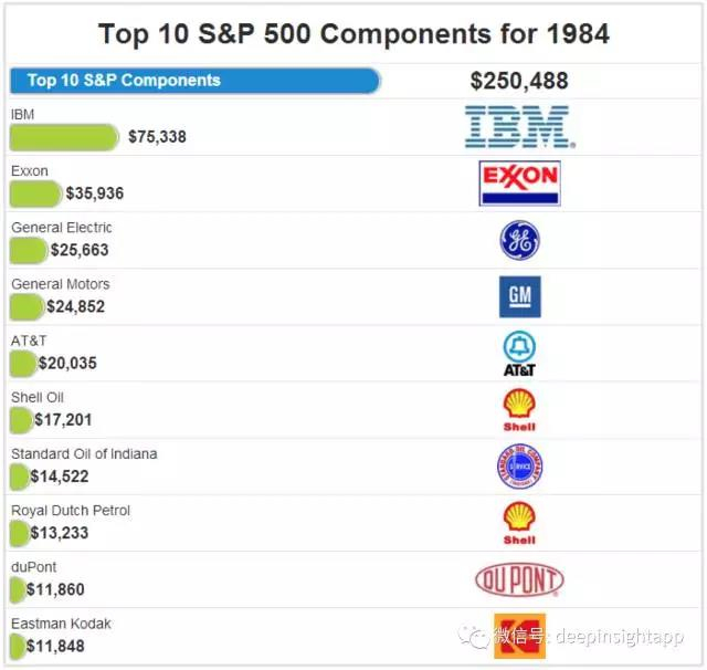 1984年的大变化来自于大石油公司时代到来。Exxon的市值达到了359亿美元,壳牌石油达到了172亿美元,而之后和壳牌合并的荷兰皇家石油的市值也达到了132亿美元。柯达继续排名第十。IBM作为全球市值最大的公司,继续给投资人带来正回报。