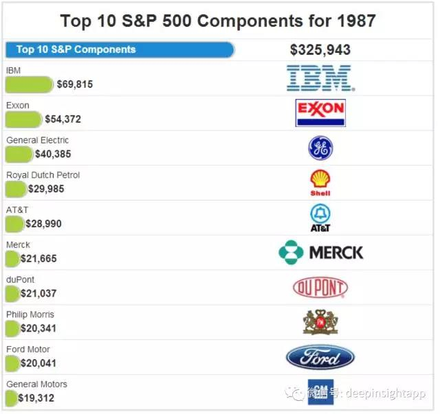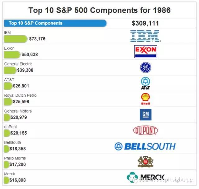 1986年最大的变化来自几个新入榜的公司,最重要的是烟草公司Philip Morris。这家以万宝路香烟出名的公司将在未来10年一直停留在市值最大的前十家公司中。小时候万宝路牛仔广告也一直停留在我们的记忆中。另一个新入榜的是制药公司默克。当然今天看,这个榜单中的许多公司因为各种原因将消失。IBM在这一年出现了比较大的调整。