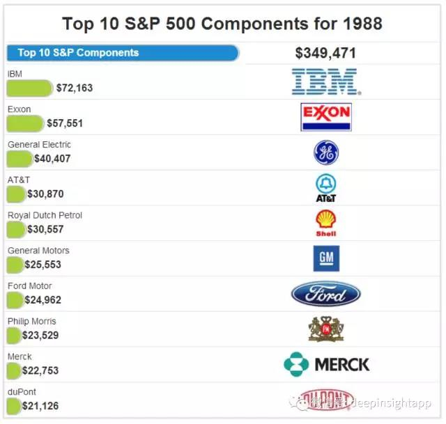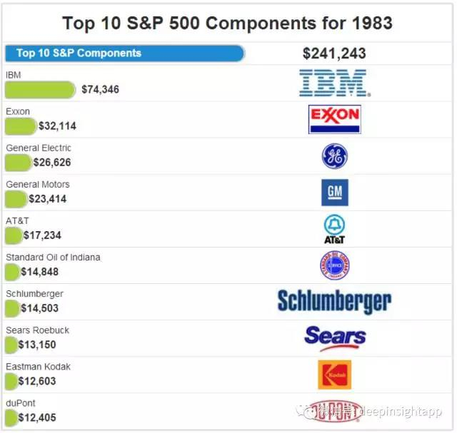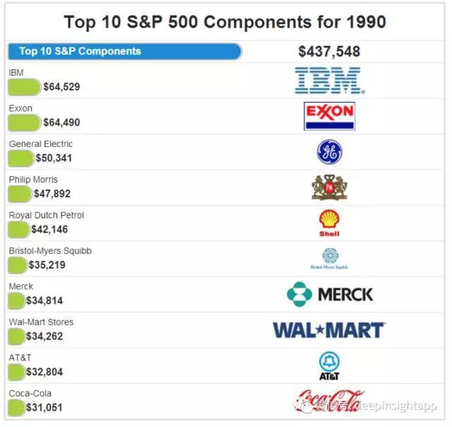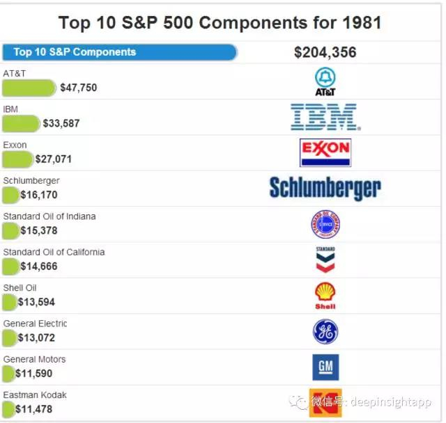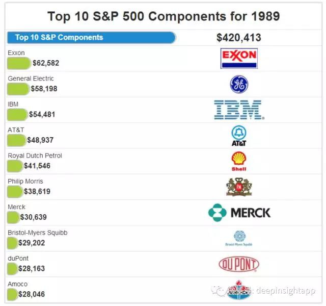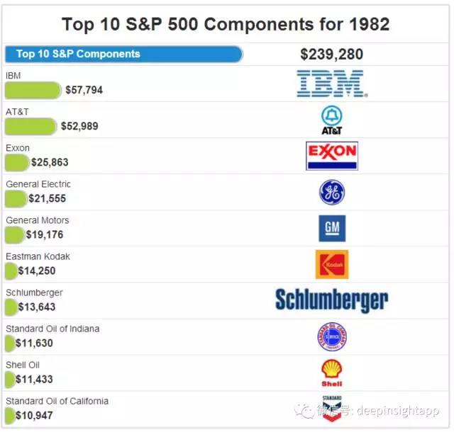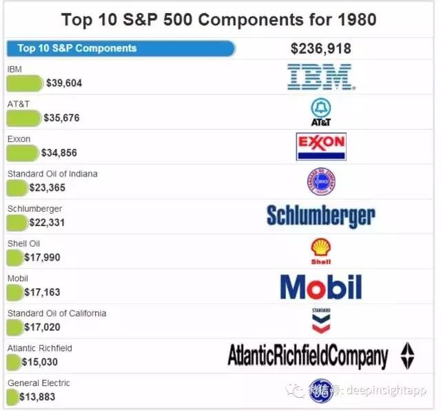如果我们看整个80年代(1980年~1990年),标普前十大市值公司的特征,一个现象就是原油,原油股占整个标普市值的50%~60%左右。