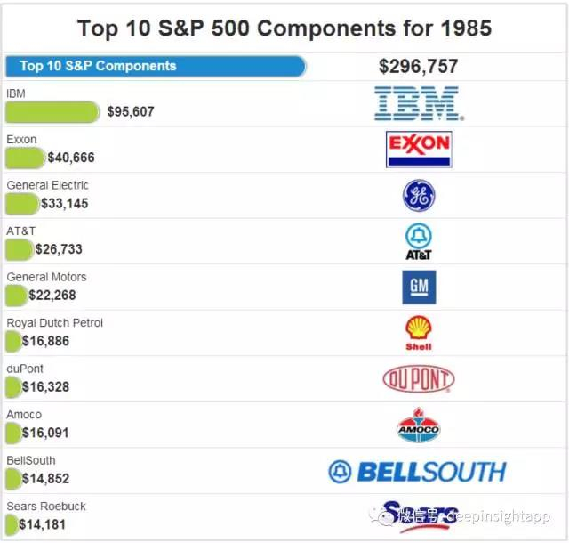 进入1985年,我们发现巨头依然给投资者带来很大的回报。IBM作为全球市值第一大的公司,每年股价都在上涨,都在给投资人带来回报(这时候IBM几乎在榜单上称霸了5年,此后仍持续称霸3年)。大公司统治的时代到来。小的变化是通信公司BellSouth第一次出现在榜单,而美国实体零售巨头Sears也再次回到了榜单。