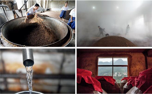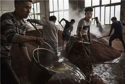 贵州省遵义仁怀市茅台镇,酿酒厂里工人们将烧开的河水准备好,用于高粱的第一次发酵。视觉中国