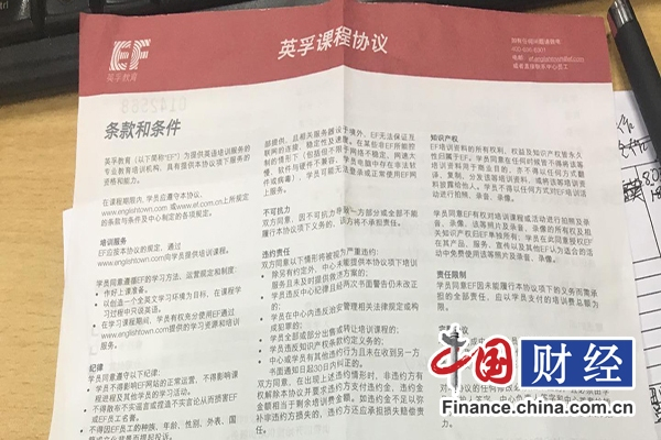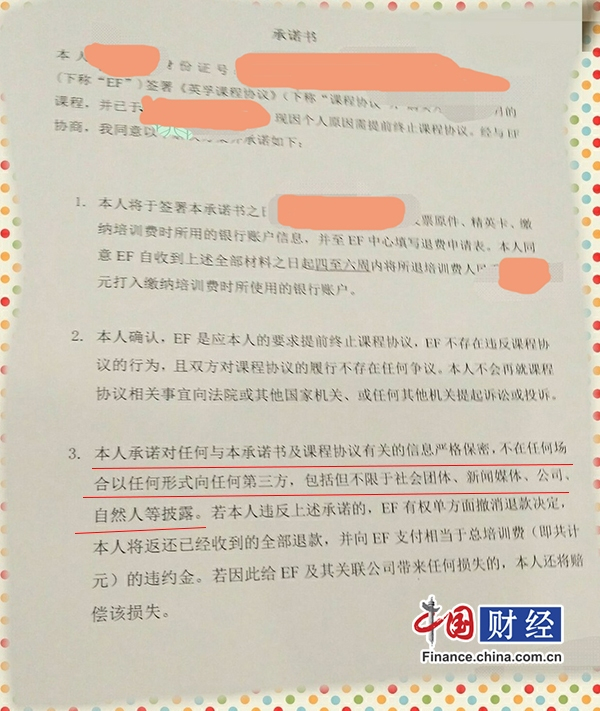 中国网财经11月13日讯(记者严鑫 实习记者杜若丹)不签“承诺书”不给退款?近日,刘女士致电中国网财经,称因不满意培训机构EF英孚教育课程质量,要求其退款,对方则提出“扣除4个月课程费和10%违约金”以及要求刘女士签署一份“不对外说退款一事”的承诺书,否则不予退款。刘女士认为,EF英孚教育提出的条件属于“霸王条款”。