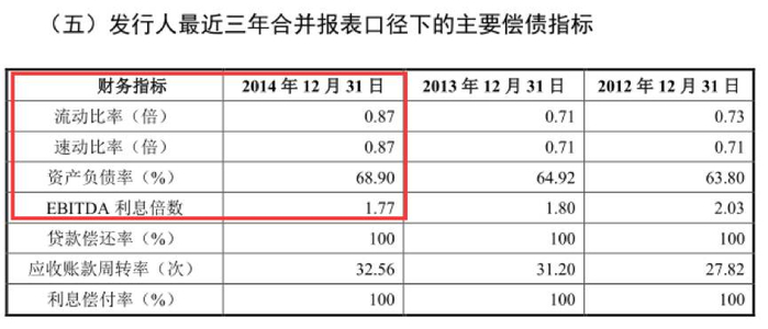 丹东港的核心财务指标长期处于不理想状态。据丹东港债券募集说明书显示,EBITDA利息倍数连年下降,2014年就已经下降到只有1.77倍,本应当引起金融机构关注。下图为丹东港债券募集说明书的截图: