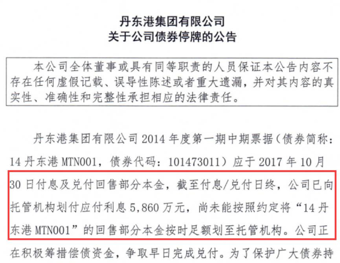 丹东港集团近日发布公告称,其2014年度第一期中期票据(债券简称:14丹东港MTN001)应于今年10月30日付息及兑付回售部分本金,已向托管机构划付了5860万利息,尚未能按照约定将该笔债券的回售部分本金按时足额兑付。