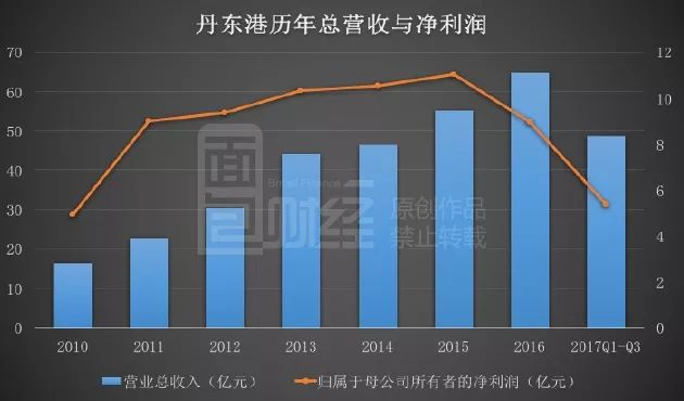 今年前三季度,丹东港总营收为48.63亿,同比下跌1.41%;净利润为5.39亿,同比大跌19.55%。2016年,其净利润就曾下降19.1%。下图为丹东港历年总营收与净利润: