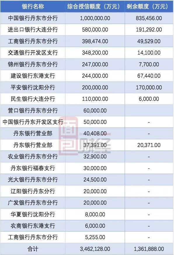 截止2017年6月底,进出口银行已使用授信额度高达38.8亿,工行两家分支机构已使用授信额度超过35亿,中国银行、农业银行、光大银行、辽阳银行和华夏银行等多家金融机构的授信额度已经全部用完!