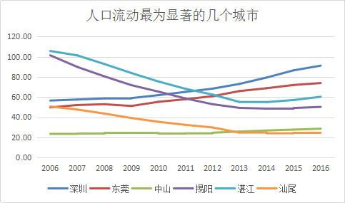 广东21个地级市,十年间人口变化情况(增速从高到底):深圳、东莞、中山、惠州、珠海、佛山、广州、潮州、阳江、河源、江门、韶关、清远、肇庆、云浮、梅州、汕头、茂名、揭阳、湛江、汕尾。