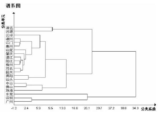 6、用马克威软件,把小学生人口增速、人口基数、第二三产业占比、GDP和GDP增速,五个维度做聚类分析,制作成聚类分析图谱,如下: