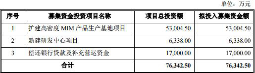 1. 扩建高密度 MIM 产品生产基地项目,项目总投资额53,004.50万元,拟投入募集资金额53,004.50万元;2.新建研发中心项目,项目总投资额6,338.00万元,拟投入募集资金额6,338.00万元;3.偿还银行贷款及补充营运资金,项目总投资额17,000.00万元,拟投入募集资金额17,000.00万元。