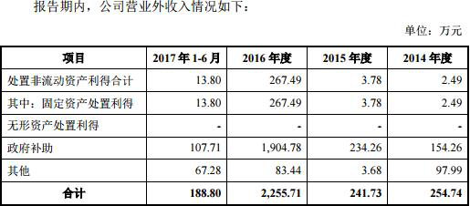 数据显示,精研科技2014年至2017年1-6月营业外收入分别为254.74万元、241.73万元、2,255.71万元、188.80万元;其中,政府补助分别为154.26万元、234.26万元、1,904.78万元、107.71万元。